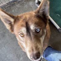 Lucky is a playful, 2-year-old red and white Husky with stunning eyes, weighing 60 lbs. and full of energy!