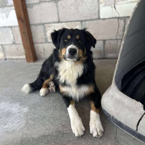 She is not housetrained yet and will potty in her overnight kennel.  She is slightly stressed when she comes inside to hang out with staff, but we are working on helping her learn to relax indoors and enjoy hanging out with humans.