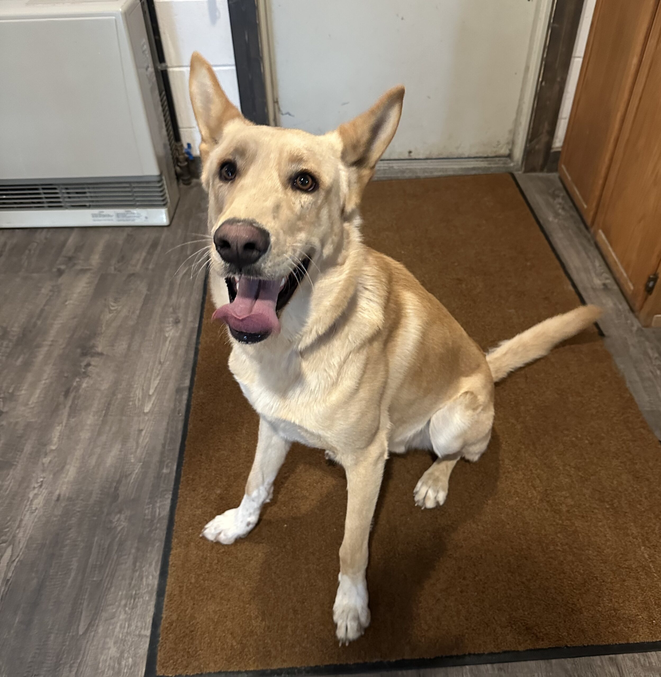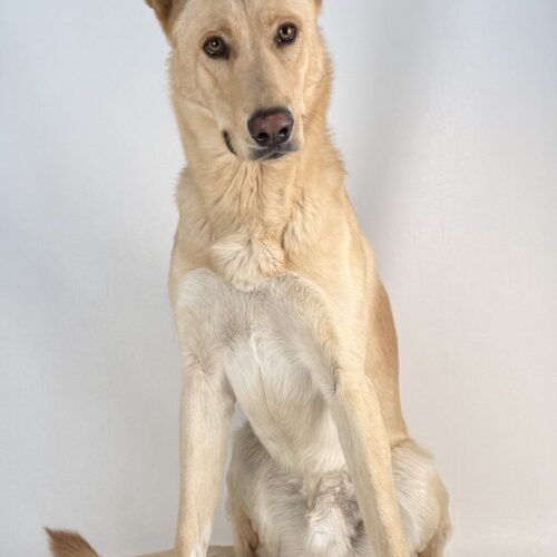 At about 67 lbs, he sports a yellow coat with adorable white socks. He’s friendly with strangers, does well with other dogs, and isn’t familiar with cats yet. He loves the snow, car rides, and playing with toys. Smart and attentive, he knows basic commands like sit, stay, and heel—and responds well to his name. A fun, loyal companion ready for his next home!