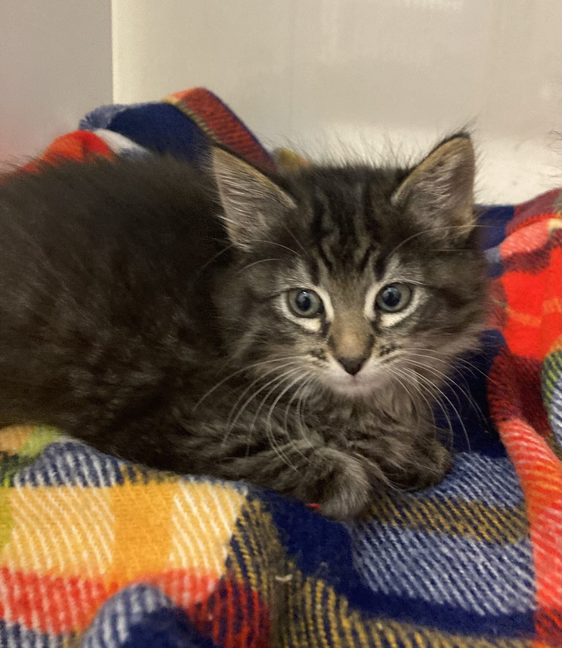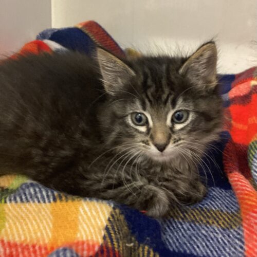 Introducing Bitzi, an 8-week-old long-haired tabby Maine Coon/Domestic Long Hair mix with a soft, fluffy coat and a big personality packed into a tiny body! She’s playful, curious, and loves attention — the perfect mix of sass and sweetness.
