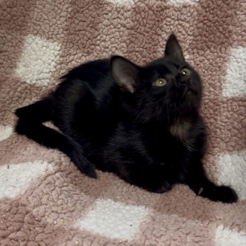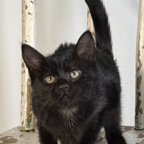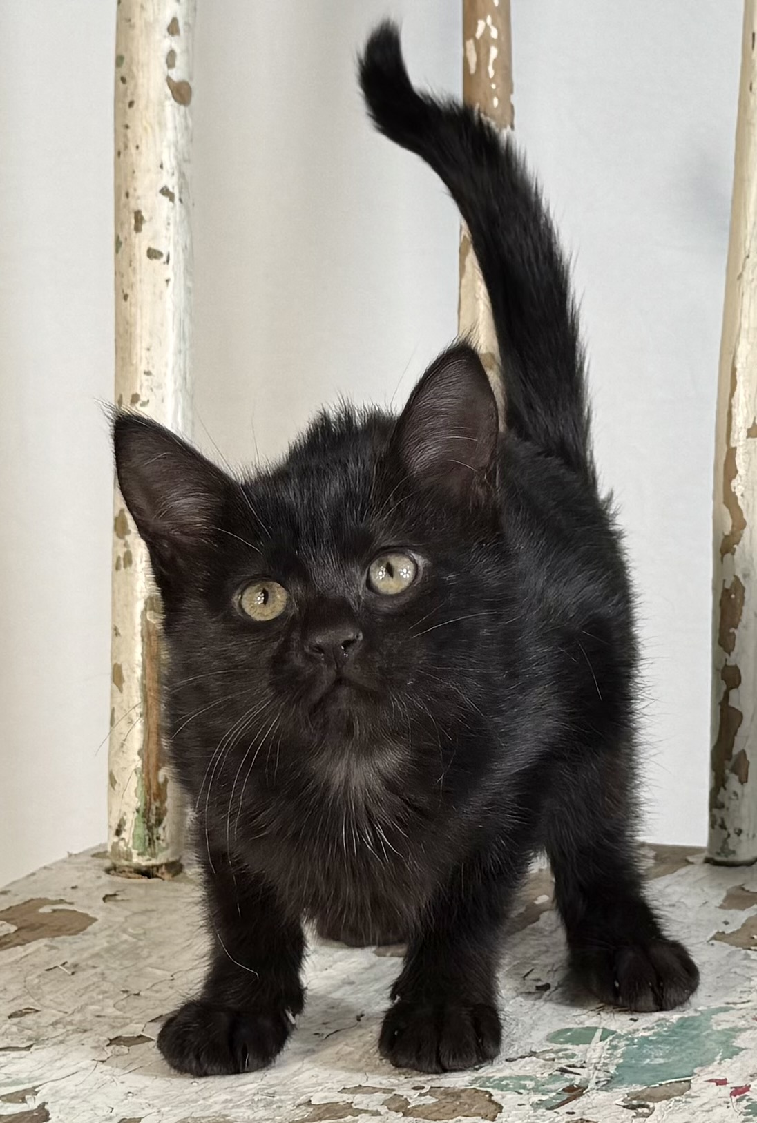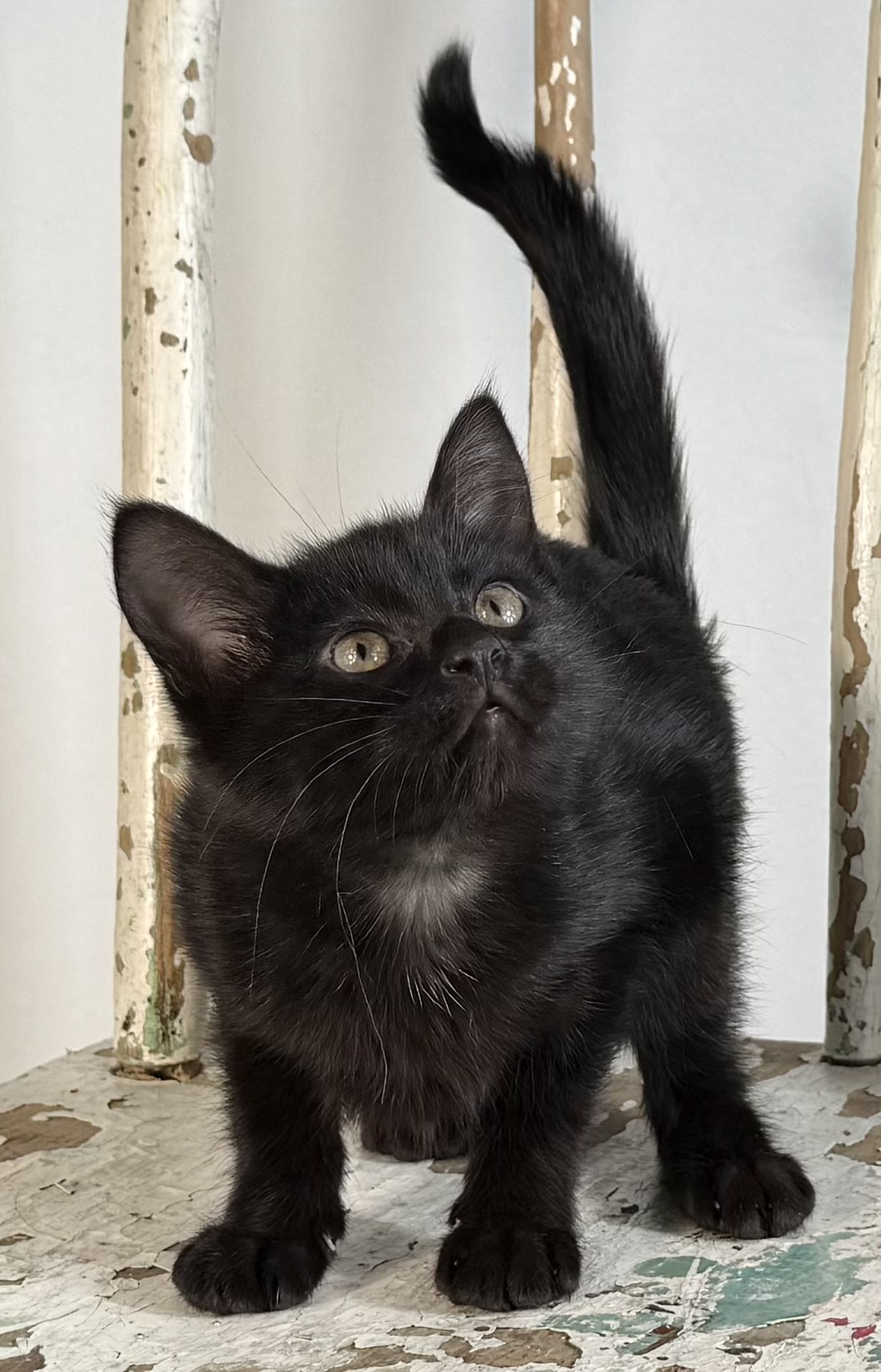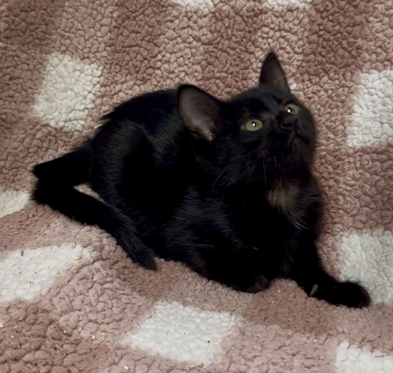 Meet Melody, an adorable 11-week-old black shorthair kitten with sleek, shiny fur and bright, curious eyes. She’s a playful little explorer who loves chasing toys, pouncing on shadows, and curling up for snuggles when she’s done adventuring. Luna is very friendly and outgoing — she’ll greet you with a soft purr and loves being around people. Whether she’s climbing, cuddling, or showing off her kitten antics, Luna is sure to bring warmth and joy to any home.