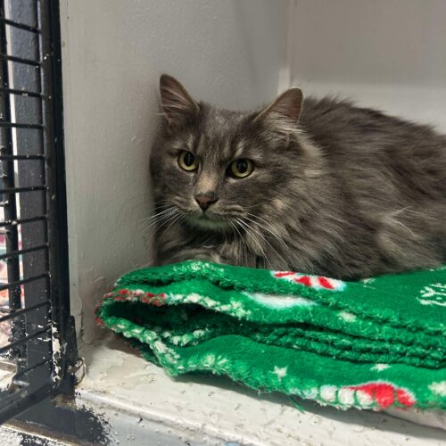 Smokey Jo is a beautiful four-year-old gray long-haired cat with a gentle and affectionate nature. She can be shy at first, especially around dogs, but she warms up once she feels safe. Smokey Jo enjoys the company of some other cats and does well with calm, respectful children. She’s looking for a quiet home where she can relax and share her sweet personality with her favorite people.